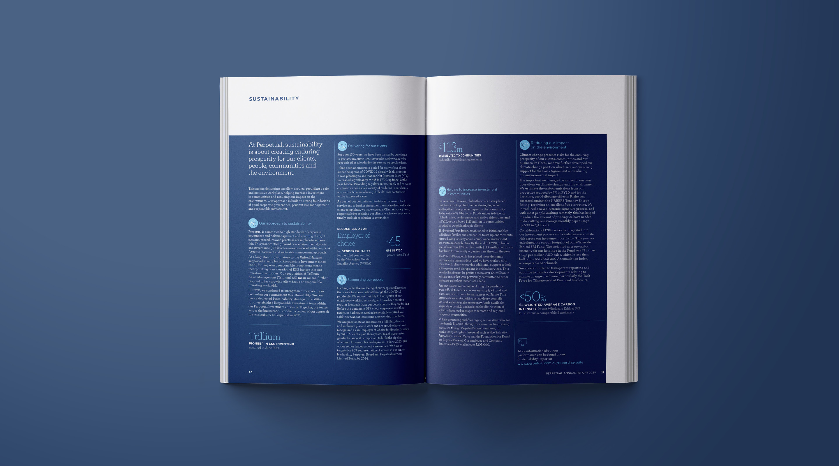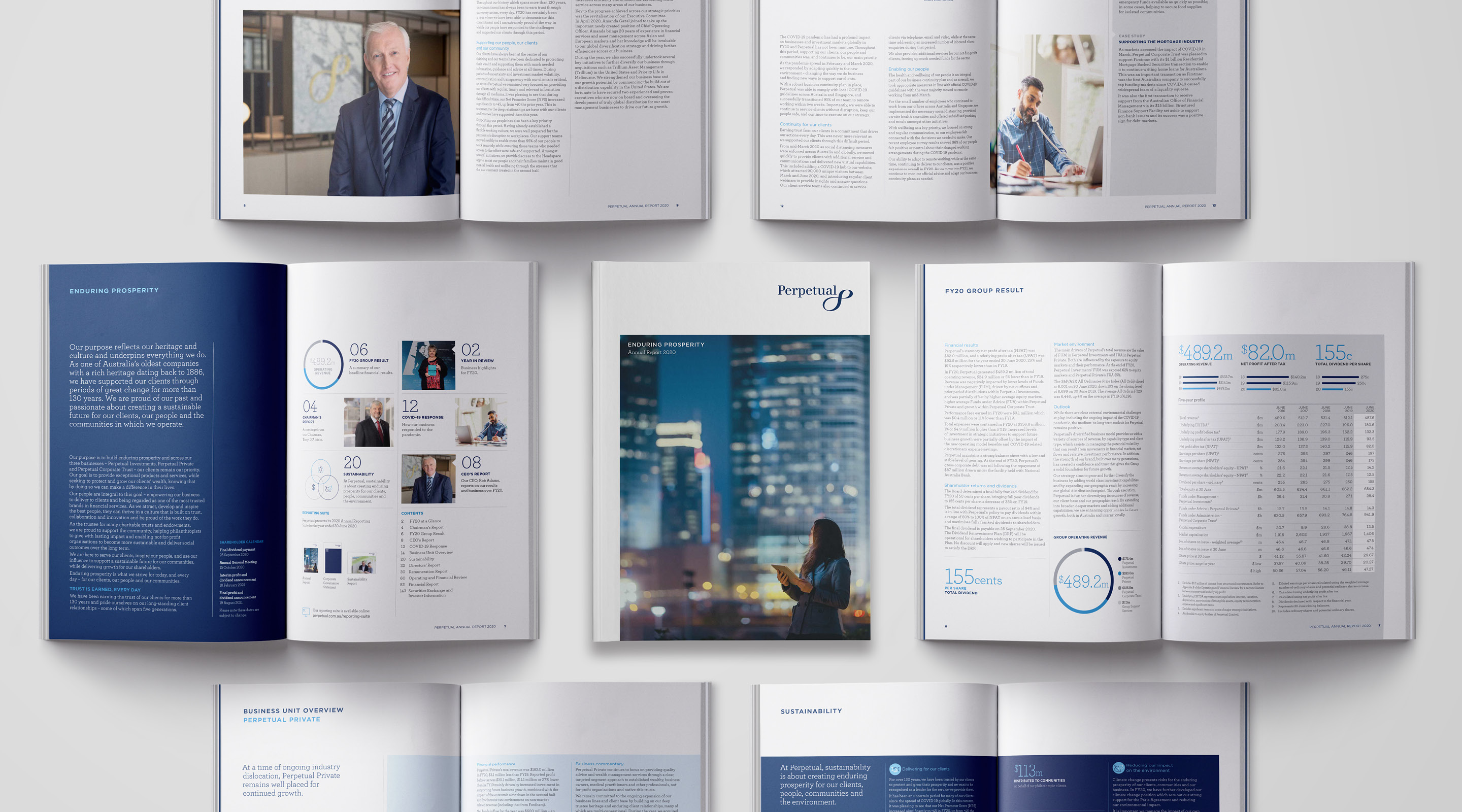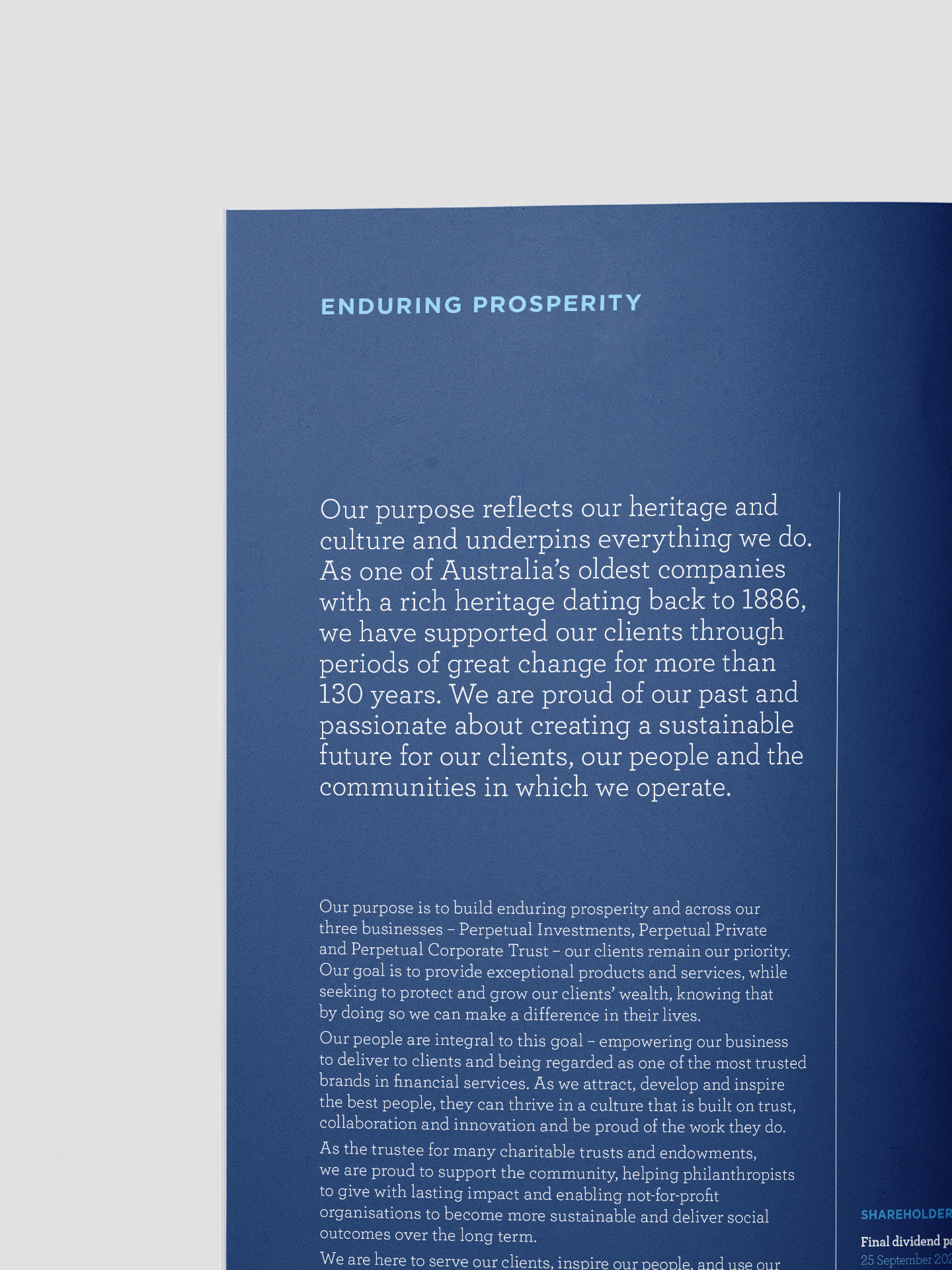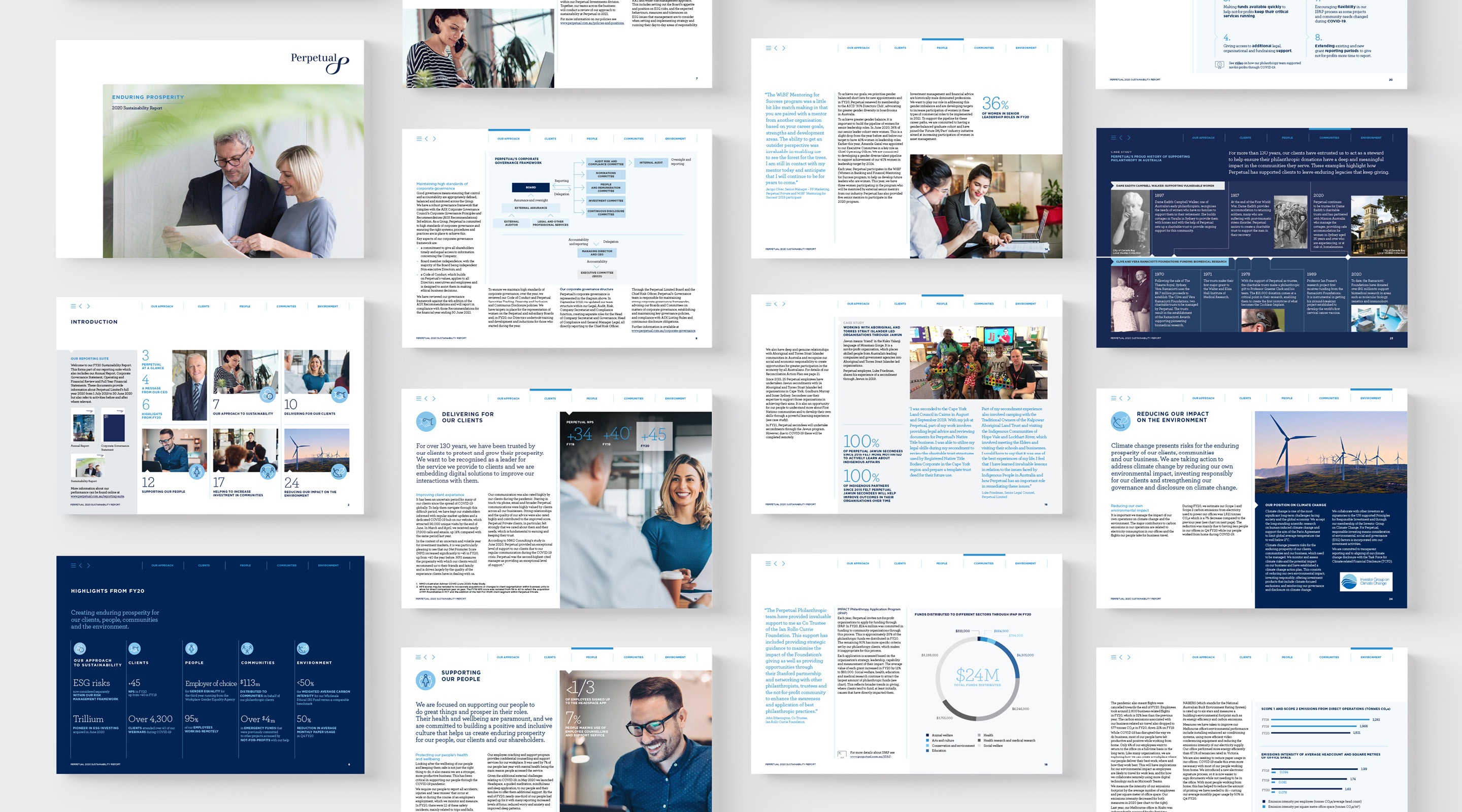 Designate started the process by consulting on the content strategy and structure of the 2020 reporting suite, aligning our recommendations with Perpetual's ambition to publish their first dedicated Annual Sustainability Report. This increased focus on environmental, social and governance considerations supported Perpetuals new investor narrative ‘Enduring Prosperity’ championing the ‘enduring’ heritage and the ongoing ‘prosperity’ that Perpetual creates for their employees, shareholders, clients and the community.