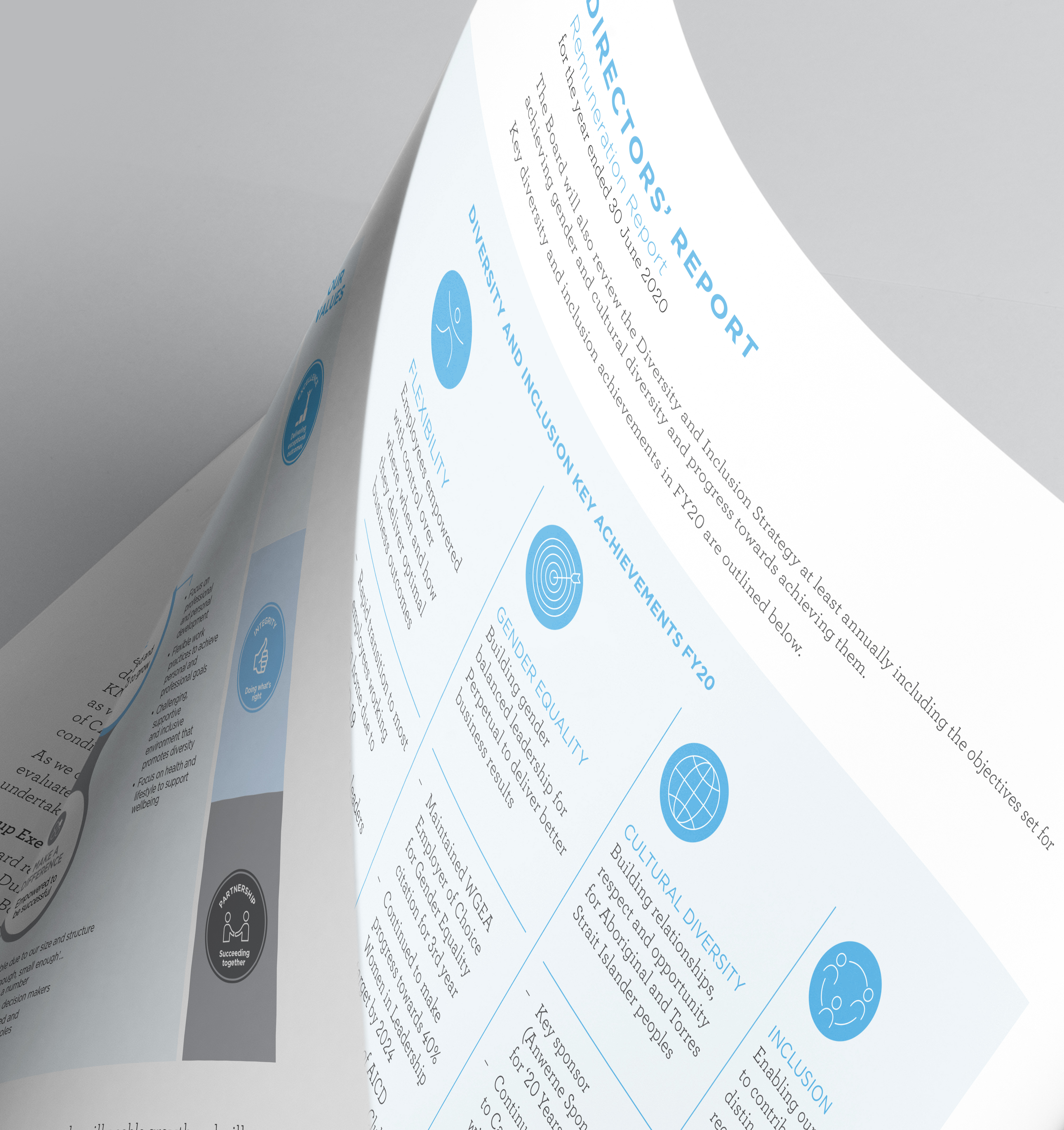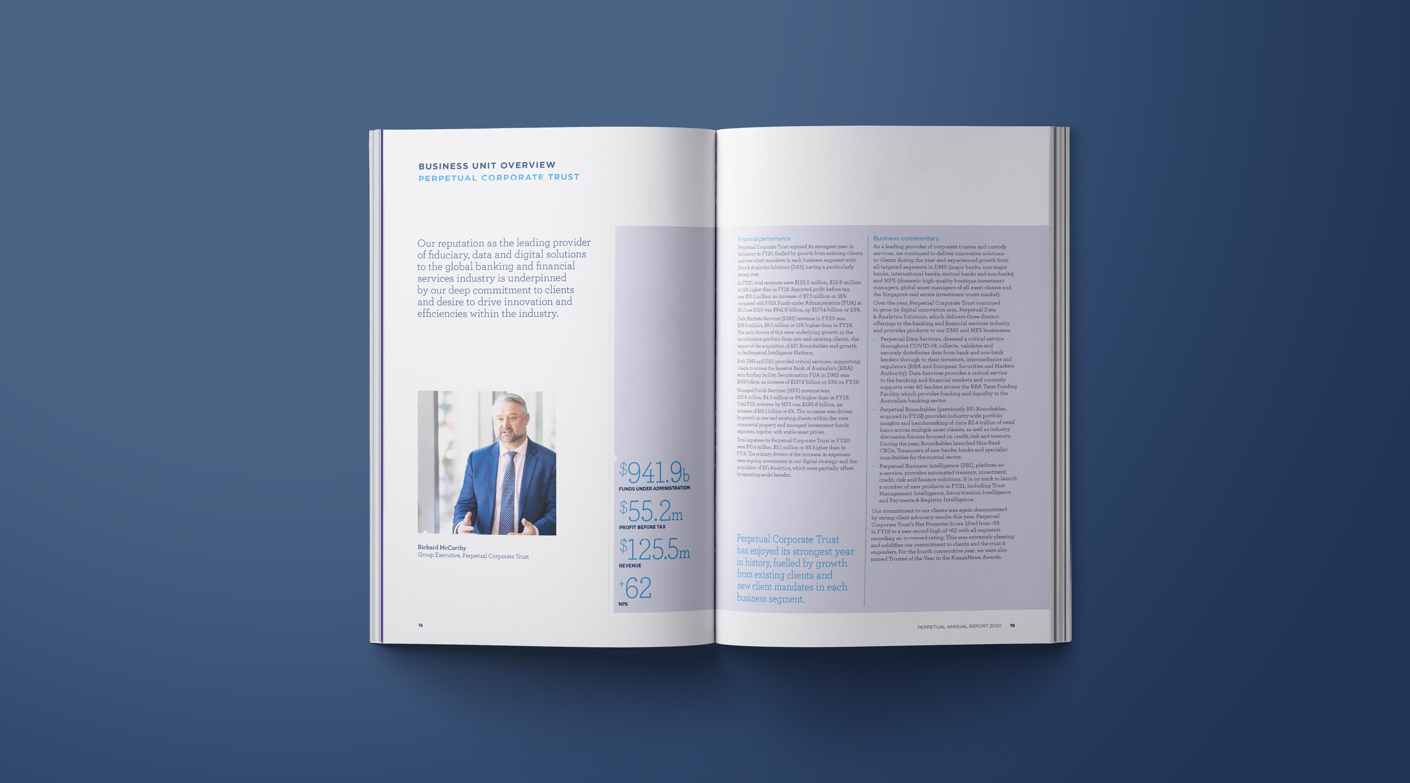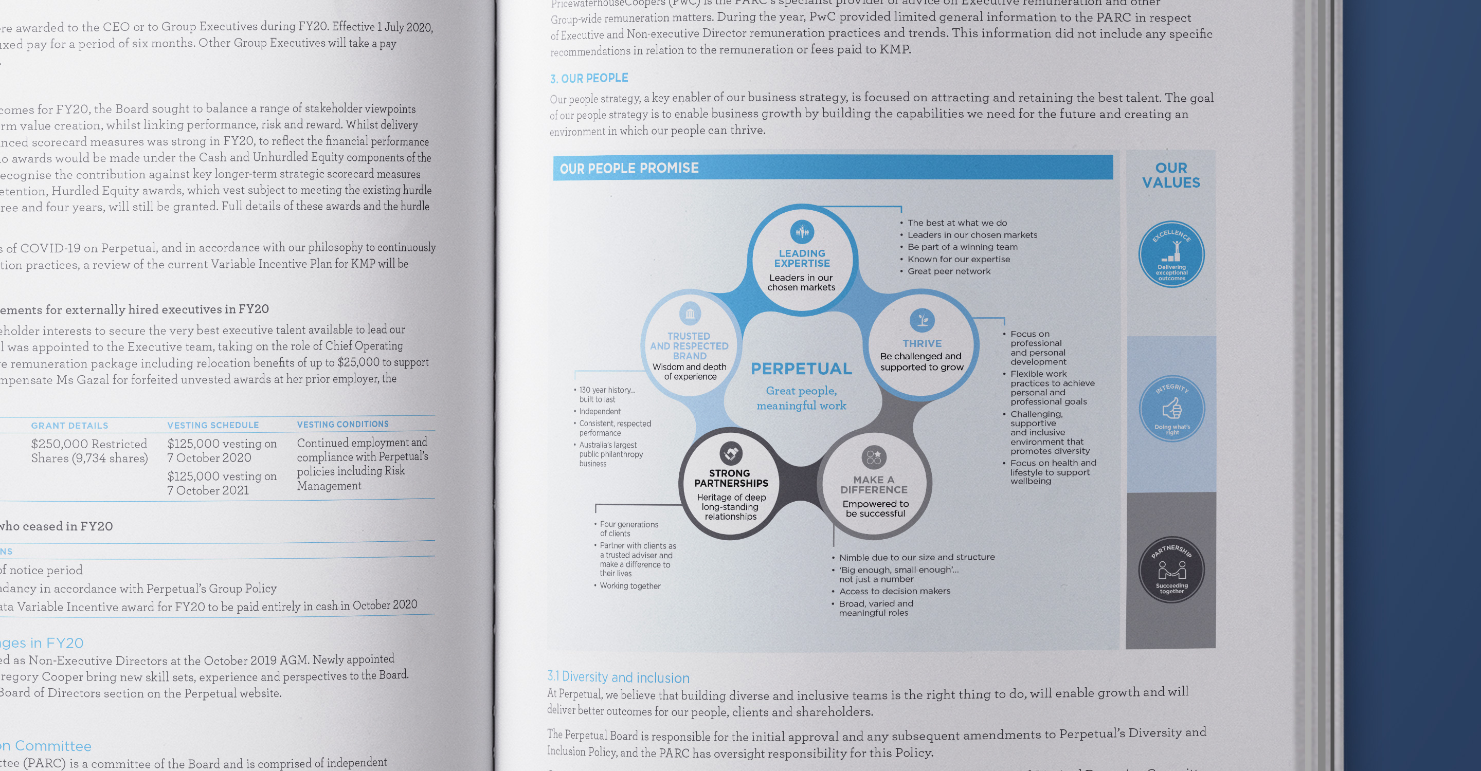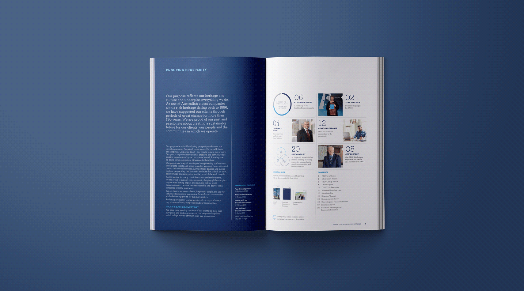 Designate started the process by consulting on the content strategy and structure of the 2020 reporting suite, aligning our recommendations with Perpetual's ambition to publish their first dedicated Annual Sustainability Report. This increased focus on environmental, social and governance considerations supported Perpetuals new investor narrative ‘Enduring Prosperity’ championing the ‘enduring’ heritage and the ongoing ‘prosperity’ that Perpetual creates for their employees, shareholders, clients and the community.